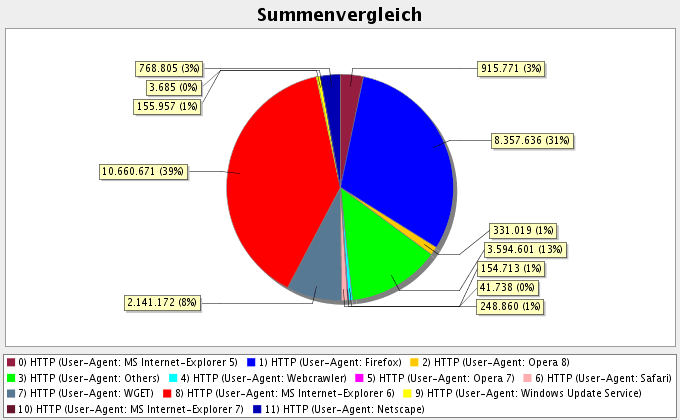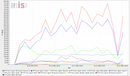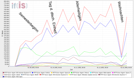 Die folgenden Graphiken zeigt die Verteilung der Browserbenutzung (inbound und outbound kumuliert) für den Fachbereich Informatik von Mitte August 2005 bis Anfang 2006. Man sieht das die Browser "Internet-Explorer 6" und "Mozilla Firefox" den Verkehr dominieren.