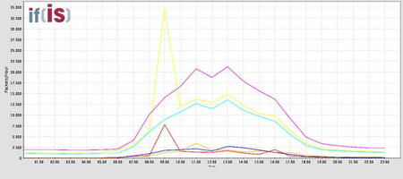 In kleinen Zeiträumen lässt sich aufgrund dieses Wissens feststellen, ob eine Anomalie auftritt. Das folgende Zeitdiagramm zeigt die Verteilung der Pakete der TCP-Verbindungssteuerung über einen Tag: